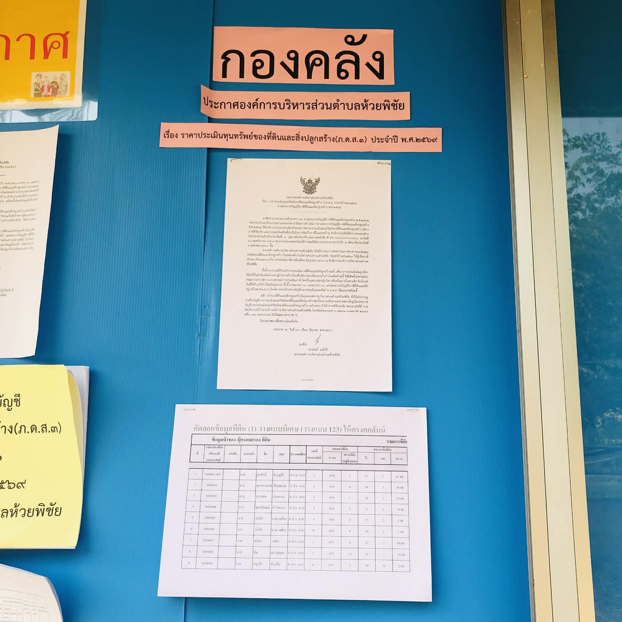 องค์การบริหารส่วนตำบลห้วยพิชัย ขอประกาศราคาประเมินทุนทรัพย์ของที่ดินและสิ่งปลูกสร้าง (ภ.ด.ส.๑) ประจำปี พ.ศ. ๒๕๖๙ เพื่อใช้เป็นฐานในการจัดเก็บภาษีที่ดินและสิ่งปลูกสร้าง