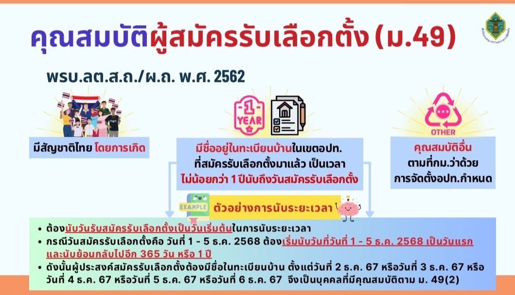 ประชาสัมพันธ์ 1 – 5 ธันวาคม 2568 เปิดรับสมัครรับเลือกตั้งสมาชิกสภาองค์การบริหารส่วนตำบลและนายกองค์การบริหารส่วนตำบล กรณีครบวาระ